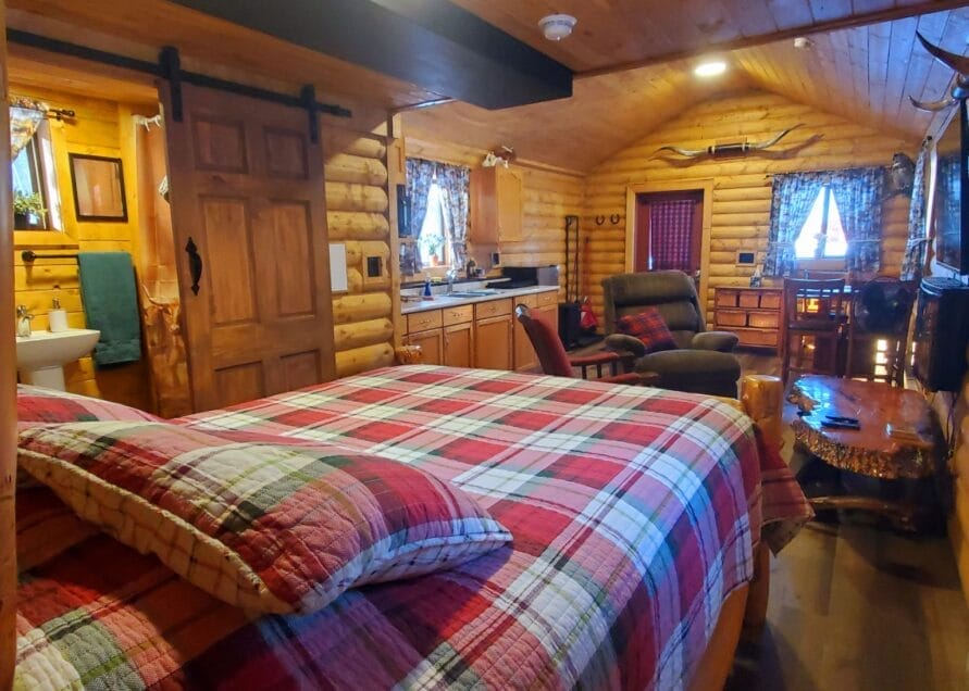 - Sleeping Arrangements: Unique log queen-size bed, plus a sleeping loft with a queen mattress.