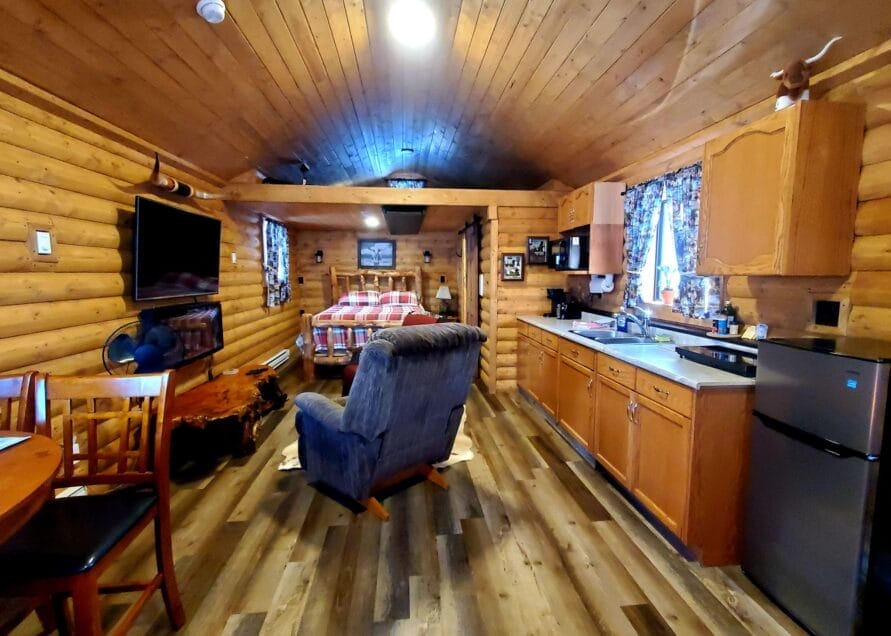 The Longhorn Cabin is our newest addition, designed for a cozy and memorable stay. Perfect for families or couples, it sleeps 2 adults and 2 kids, with a sleeping loft (accessed via a steep ladder) featuring a queen-size mattress ideal for older children.