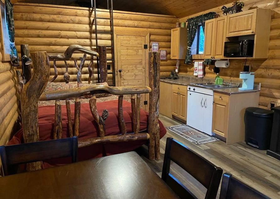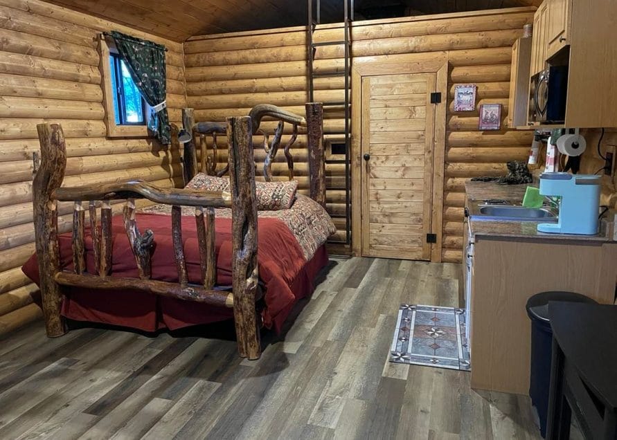 The number of people sleeping comfortably in the Moose Cabin is 2 adults, but there is a sleeping loft with mattresses where a little bit older kids can sleep if they can safely climb a steep ladder.