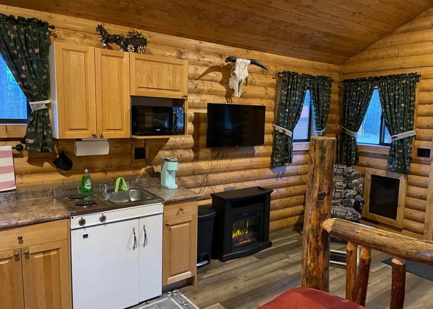 Included is: Kitchenette, microwave, mini-fridge, Keurig coffee maker, toaster, pots, and pans, a smart TV, and an electric fireplace.