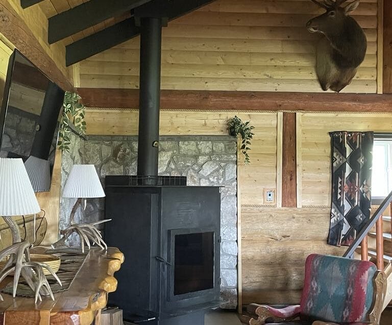 The Yellowstone is our unique lodge style cowboy/rancher cabin inspired by the show Yellowstone. It is located privately by our beautiful pond and will sleep 6 adults. It has a King bed, a queen bed and a murphy bed with a double bed in it. It has a HUGE wood burning stove and a bar and a full size kitchen, built to host. This cabin is ideal if want to host a party and you rent more than one cabin but you want one that you can all get together in. It is $400/night plus GST and plus a $50 cleaning fee that applies once per stay. Please phone us to book as our website is not working as it should. 780-621-0981